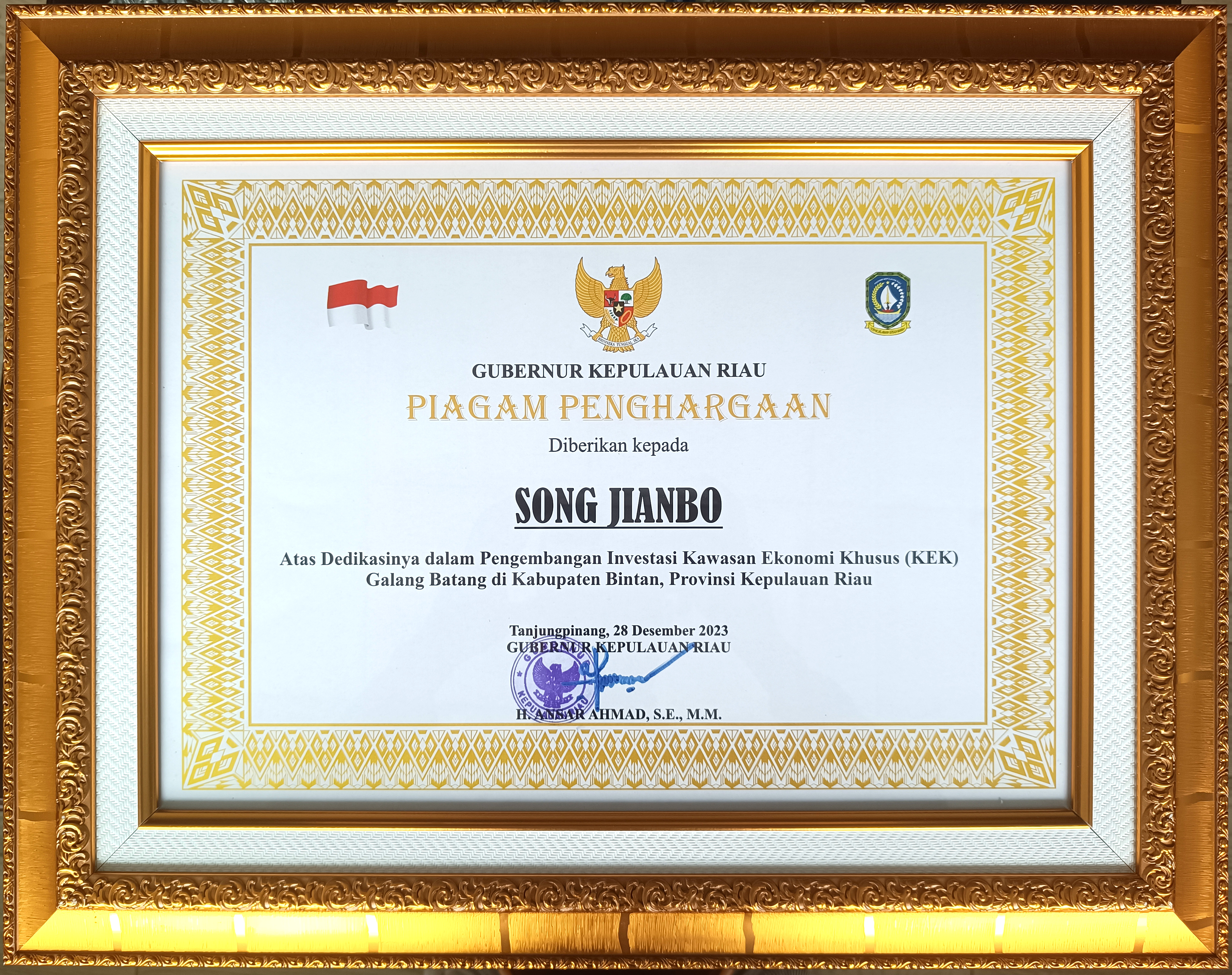 為表彰南山控股董事長宋建波先生對印尼廖內群島省建設發展做出的卓越貢獻,2023年12月28日,廖內群島省省長安薩爾·艾哈邁德(Ansar Ahmad)在廖內群島省政府為宋建波董事長頒發了“廖內群島省投資與發展卓越貢獻獎”。